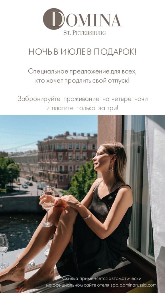 Скидка применяется автоматически на официальном сайте отеля spb.dominarussia.com при бронировании от четырёх ночей.