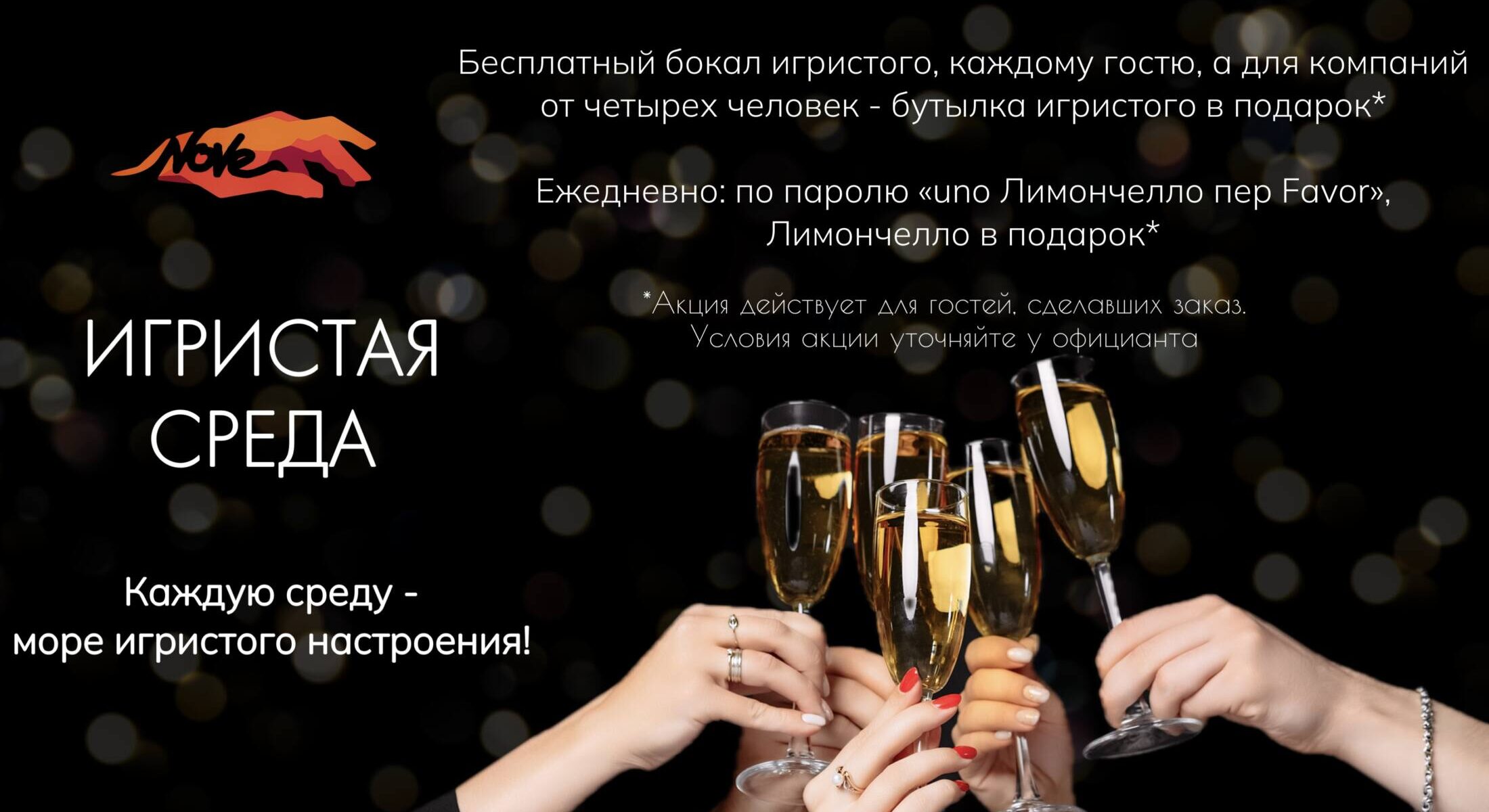 Бесплатный бокал игристого, каждому гостю, а для компаний от четырех человек — бутылка игристого в подарок*